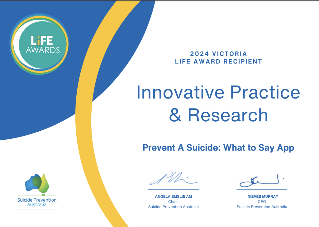 A copy of the Award presented for the In Tough Times Text concept by Dr David Horgan and the team at the Australian Suicide Prevention Foundation is available for download – Award Certificate.