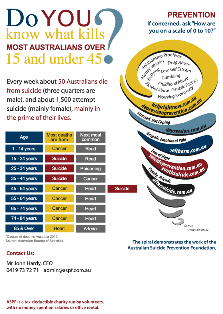 Equivalent to a plane full of Australians attempt suicide each day, mainly healthy young women aged under 30. What kills those around you in the prime of life (ages 15-44) is not car accidents; it is suicide far more often, mainly healthy males.